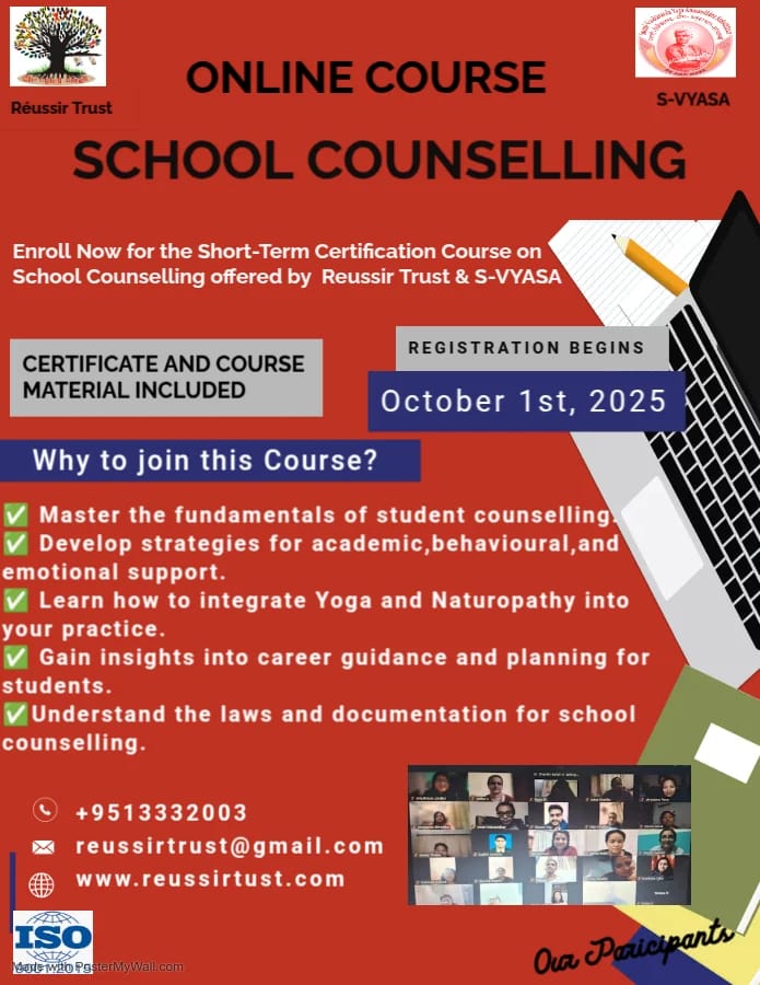 School Counseling Course-35 hrs Introduction to Counselling Counselling SkillsBehavioral managementIntroduction Law and accommodation-Career CounsellingYoga and Naturopathy